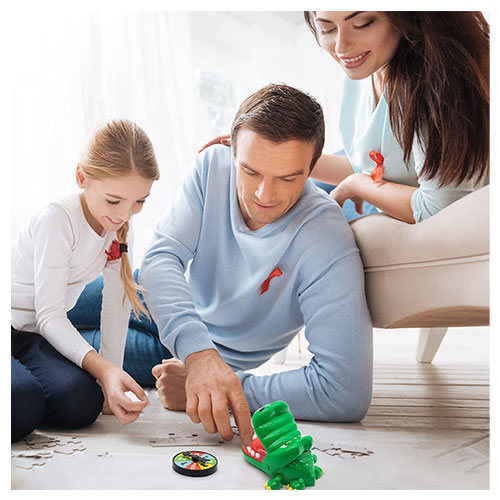Crocodile Game Rules: Crack open the crocodile’s mouth. simply press on a single tooth. The play moves on to the next player. If the crocodile chomps your hand, you are out of the game. Reset the crocodile and continue playing until only one player remains. Random Bite You: Every time you open the croc’s mouth a random tooth will be sore. You never know which tooth will cause his jaw to snap shut.